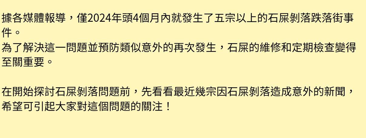 以上不幸的事件中,往往是因為業主未有遵從修葺令,或是明知有剝落風險,依然採取「拖得就拖」的態度,因而造成意外的發生!市區重建局數字顯示,截至2023年,香港有2.6萬幢30年或以上樓齡樓宇,其中約5200幢被評為「失修」或「明顯失修」,若該類樓宇不進行復修或保養,預計至2030年將有逾兩萬幢樓宇瀕臨「失修」或「明顯失修」。我們所處的社區中,時刻都隱藏著無數「計時炸彈」,出街人人自危!究竟,社會各持份者如何看待這件事、又會如何讓大廈法團/業主積極去「拆彈」呢?現在,筆者同大家了解一下石屎剝落的成因與相關法例。